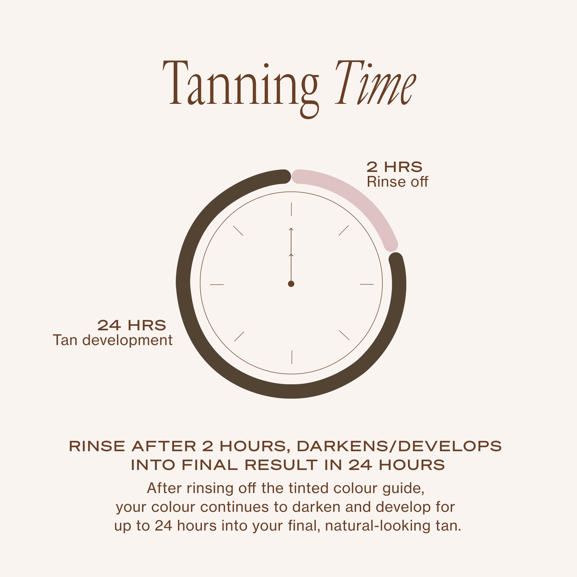 - Rinse colour guide off after 2 hours. Your tan will continue to darken and develop into your final colour for up to 24 hours.